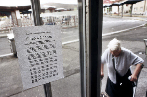 Proud lidí, co naštvaní či ustaraní odcházejí od přepážky informací, jež je ujistí, že jim to skutečně nejede, je neustálý. Před okénkem se tvoří fronta a po hodině očumování jsem až překvapen počtem těch, kterým ta nedohoda úředníků zasáhla do života. Jsou to lidé v levném oblečení, s taškami plnými věcí, jež kamsi transportují, studenti a stařenky, chlapíci v bundách od Vietnamců, co jedou z práce, vesnické ženy jedoucí z nákupu, důchodkyně na cestě od lékaře. Těch, kteří nemají auto, nemají na taxíka a musejí se kodrcat autobusem, je prostě hodně. Více, než si současný městský člověk připouští. Přesněji -kolaps autobusové dopravy v Ústeckém kraji postihl asi čtyřicet tisíc lidí.